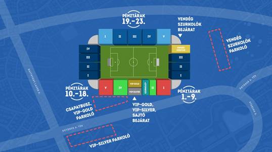 - A K1 elnevezésű (Aréna Keleti Tribünjén elhelyezkedő) vendégszektor kerül megnyitásra a vendégszurkolók számára. Belépés az észak-keleten lévő vendégszurkolói bejáraton keresztül.