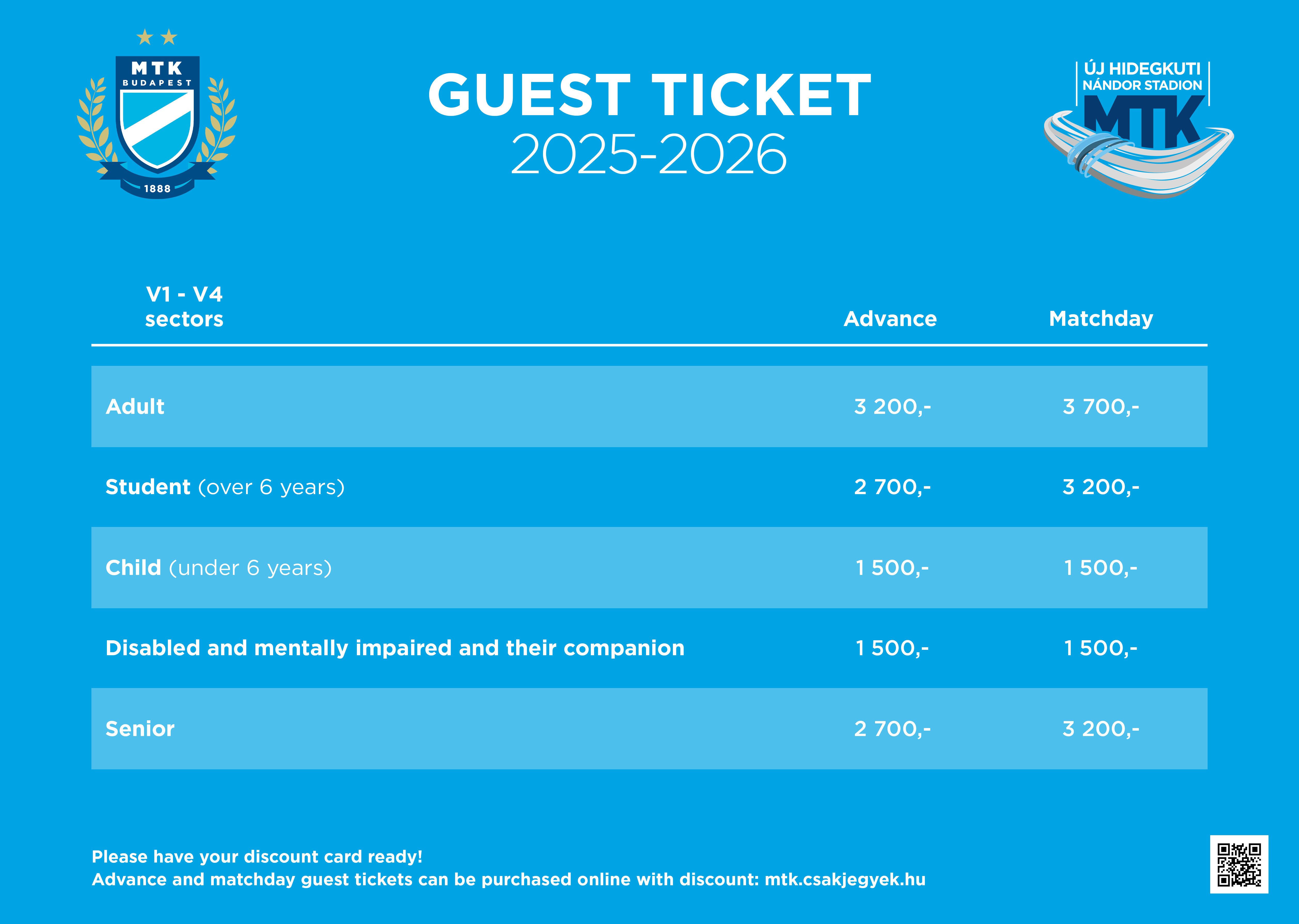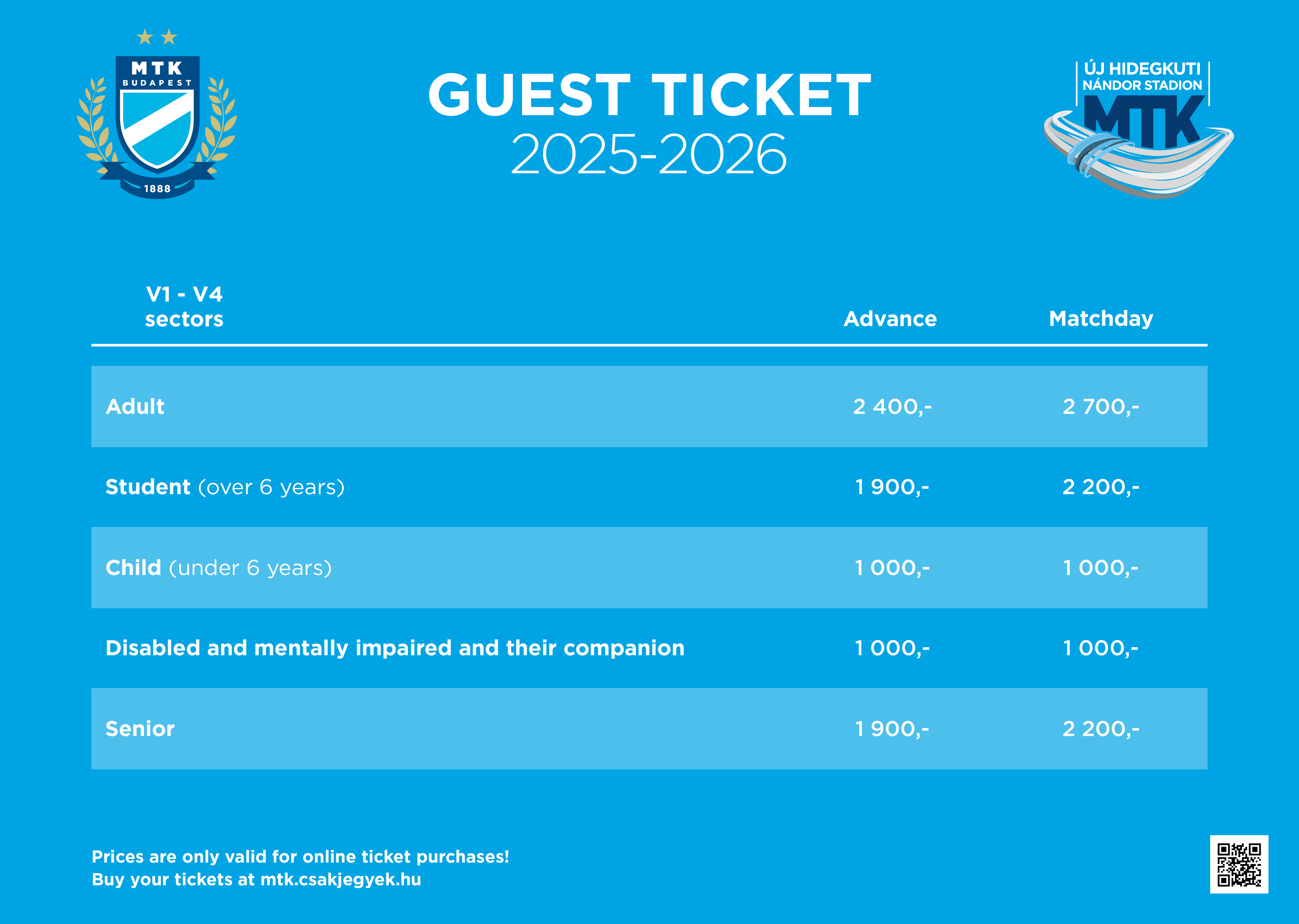 Tickets for the home and away matches of MTK Budapest Zrt. may be previously bought at mtk.csakjegyek.hu webpage. In general, online tickets are available two weeks before the game. We usually give more than 15% discount for the home game tickets,if you buy it in advance.
